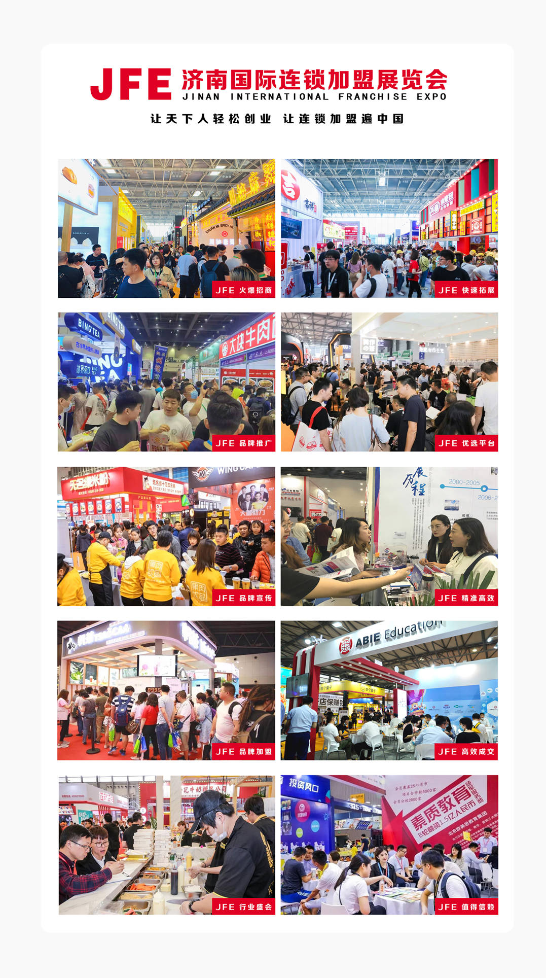 JFE济南国际连锁加盟展历时十余年,连续举办10届,集权威性、公信力和专业性为一体,切实保护加盟投资人的权益,累计服务超过100万国内外加盟投资者,是国内加盟投资配对的首选平台。