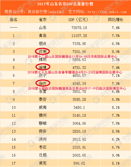 2018临沂糖酒会据中商情报网讯:2017年山东省经济总体保持稳中向好发展态势,2017年山东GDP总量突破7万亿,共计72678.18亿元,比上年增长7.4%。青岛以11037.28亿元排名第一,淄博反超济宁,菏泽反超滨州。8城GDP增速均超全省平均水平,日照GDP增速最高,为9.0%。