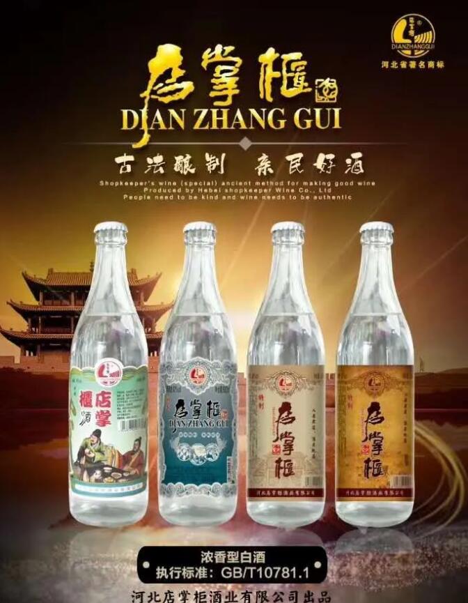 河北店掌柜酒业有限公司,位于中国历史文化名城——保定;店掌柜酒业是近年发展起来的明星企业,资产总值2800多万元,占地面积26000㎡,建筑面积6800㎡、员工300多人、储酒容量1000多吨。全自动生产线3条,发酵、酿造、勾兑技术和质量控制、检测手段都具备了国内先进水平,是中国北方初具规模的中型企业。本公司在日趋激洌的市场竟争中,企业始终坚持“以质量求生存,靠科技求发展”的治厂方针和名牌战略,以“店掌柜”商标为龙头系列产品。以高粱为主要原料配以大麦、小麦中温曲为糖化发酵,采用传统工艺低温发酵,分级储存,精心勾兑而成。理化指标和卫生指标均符合国家颁布的蒸馏酒优级标准。酒质清亮透明,窖香浓郁、绵甜醇和,酒体浓厚、余香悠长。产品畅销江苏、河北、湖南、山东、广东、河南、北京及周边市县。深受广大销费都好评。